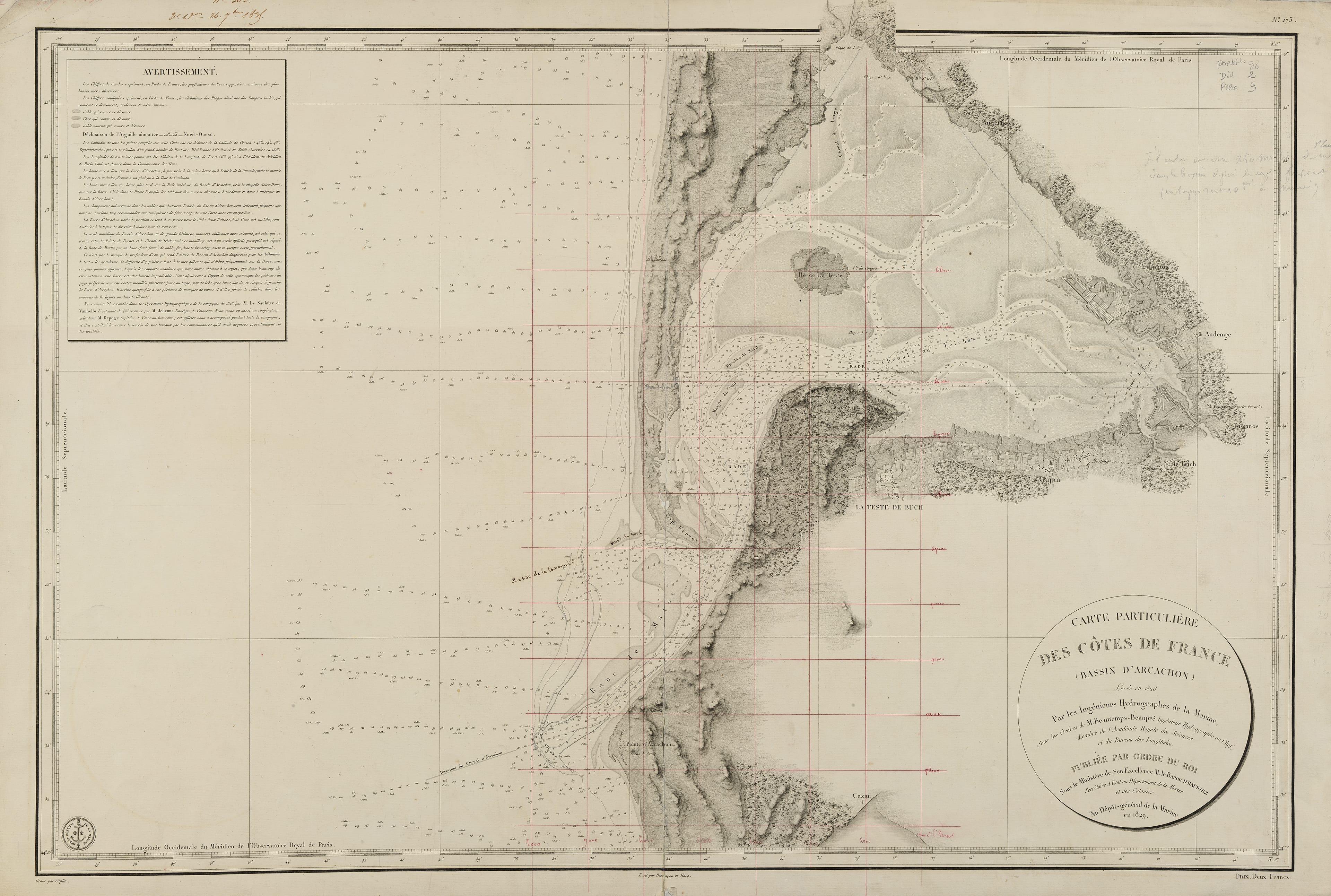 1re carte marine moderne du bassin d’Arcachon, cette planche positionne chaque danger et chaque sonde en mer géométriquement par rapport à un réseau géodésique terrestre, lié à des positions astronomiques.